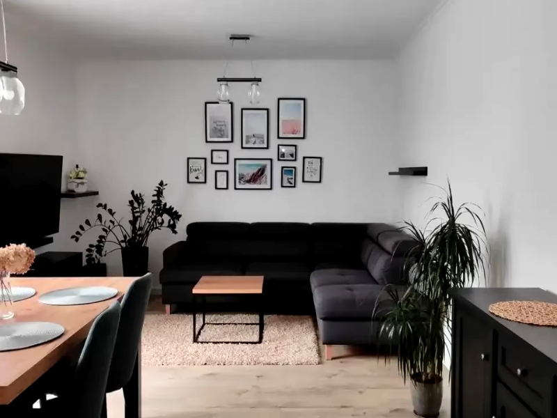 Pokój dzienny: narożnik z funkcją spania, komoda, stół, krzesła, tv smart, kino domowe.
