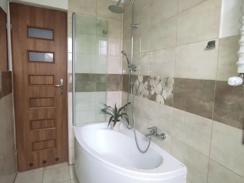 Łazienka: wanna z prysznicem, umywalka i toaleta.